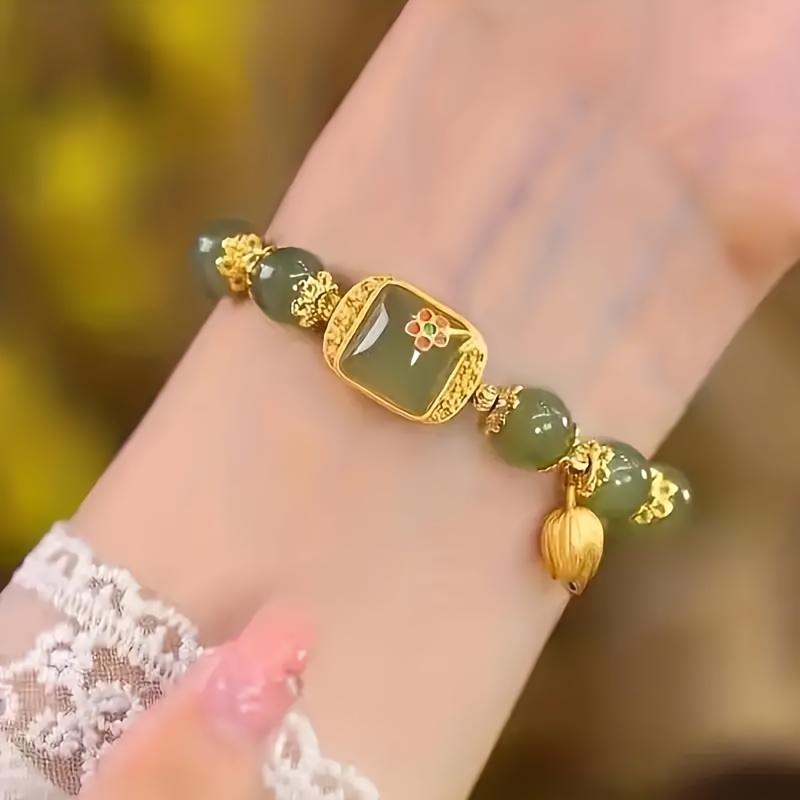 Green Jade Beaded Bracelet with Gold Lotus Charm – Elegant Lucky Jewelry Gift for Women